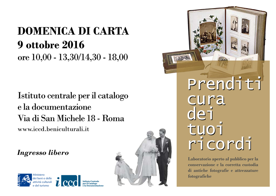Anche quest’anno l’ICCD apre le sue porte al pubblico con il Laboratorio “Prenditi cura dei tuoi ricordi”. Gli esperti dell’ICCD saranno a disposizione per esaminare le fotografie portate dal pubblico ed offrire utili indicazioni sulle tecniche esecutive e sulle modalità di conservazione di raccolte fotografiche antiche, negativi su vetro e pellicola, album e vecchie attrezzature fotografiche.