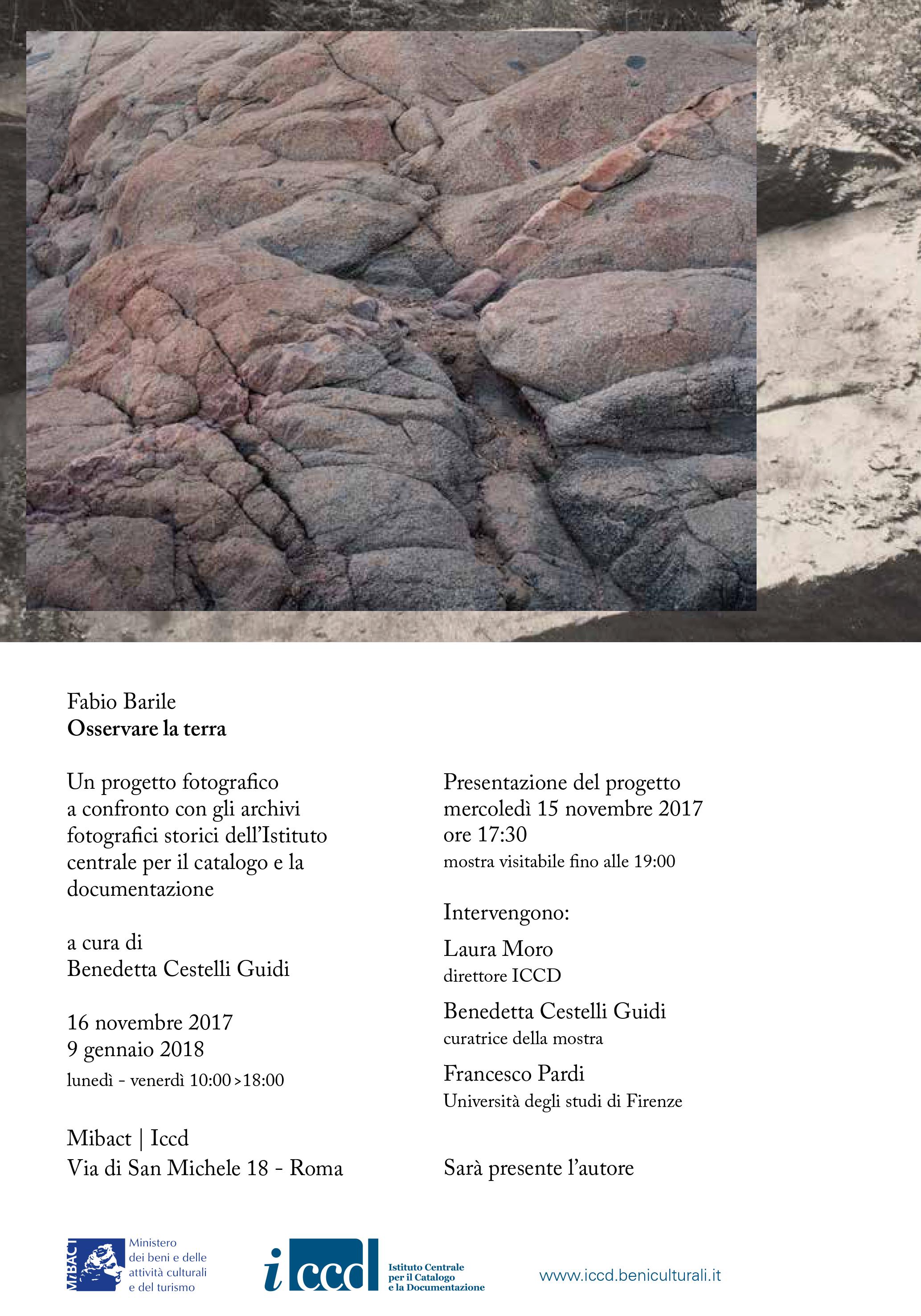 Nel 2017 Fabio Barile ha iniziato a confrontare il suo lavoro con la fotografia conservata negli archivi storici dell'Istituto centrale per il catalogo e la documentazione; la mostra Osservare la terra documenta il dialogo tessuto ed intende restituire sul piano squisitamente visivo alcune riflessioni nate da questa nuova fase di elaborazione del progetto fotografico.
