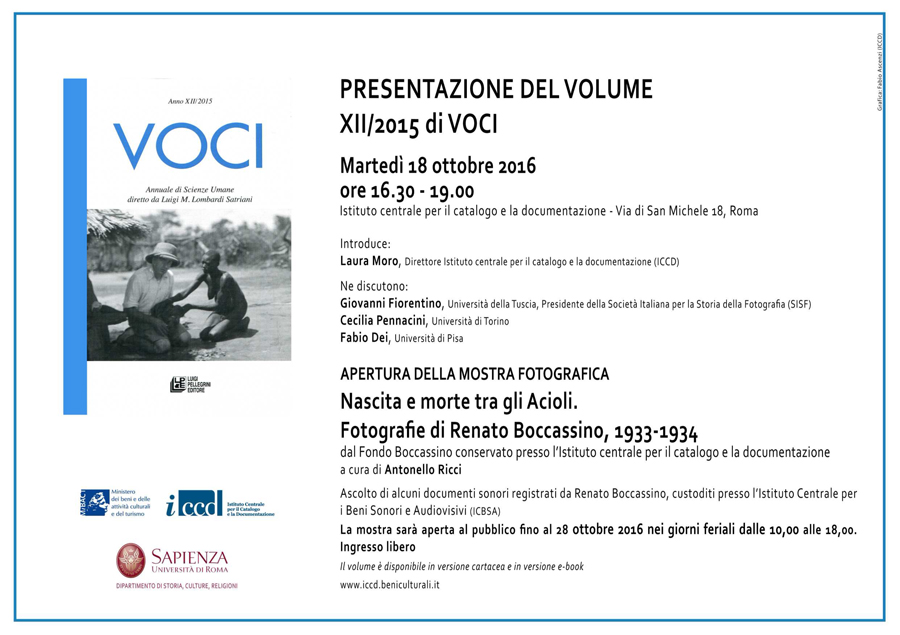Presentazione del volume XII/2015 di Voci e apertura della mostra Nascita e morte tra gli Acioli. Fotografie di Renato Boccassino, 1933-1934 a cura di Antonello Ricci